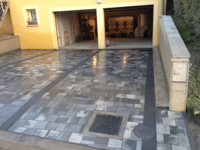 POSE DE PAVES KRONIMUS NOIRS ET BLANCS 645 AVEC HARMONIE GR NOIR 514 POUR MOTIF / JOINTS EN SABLE POLYMERE / 57530 SANRY SUR NIED